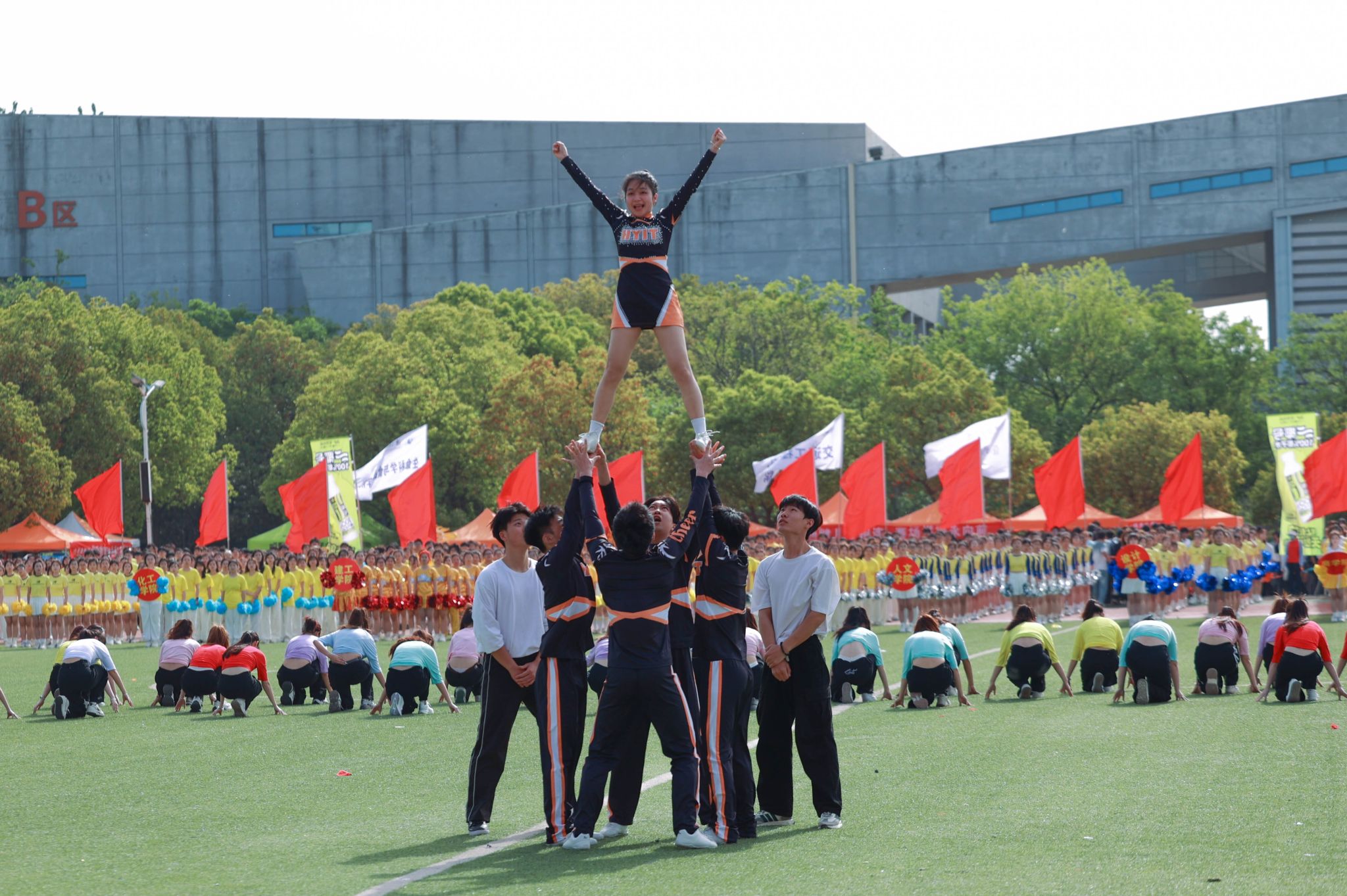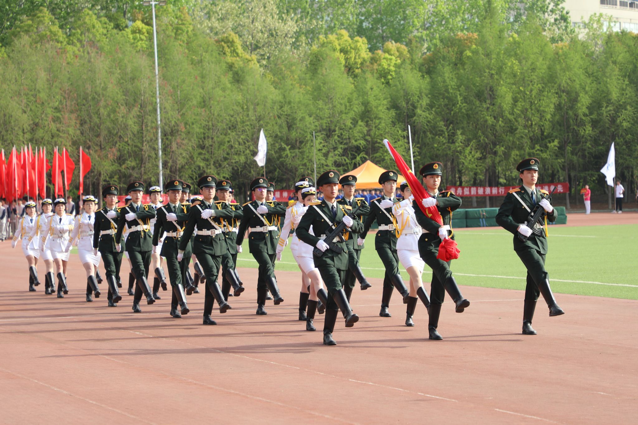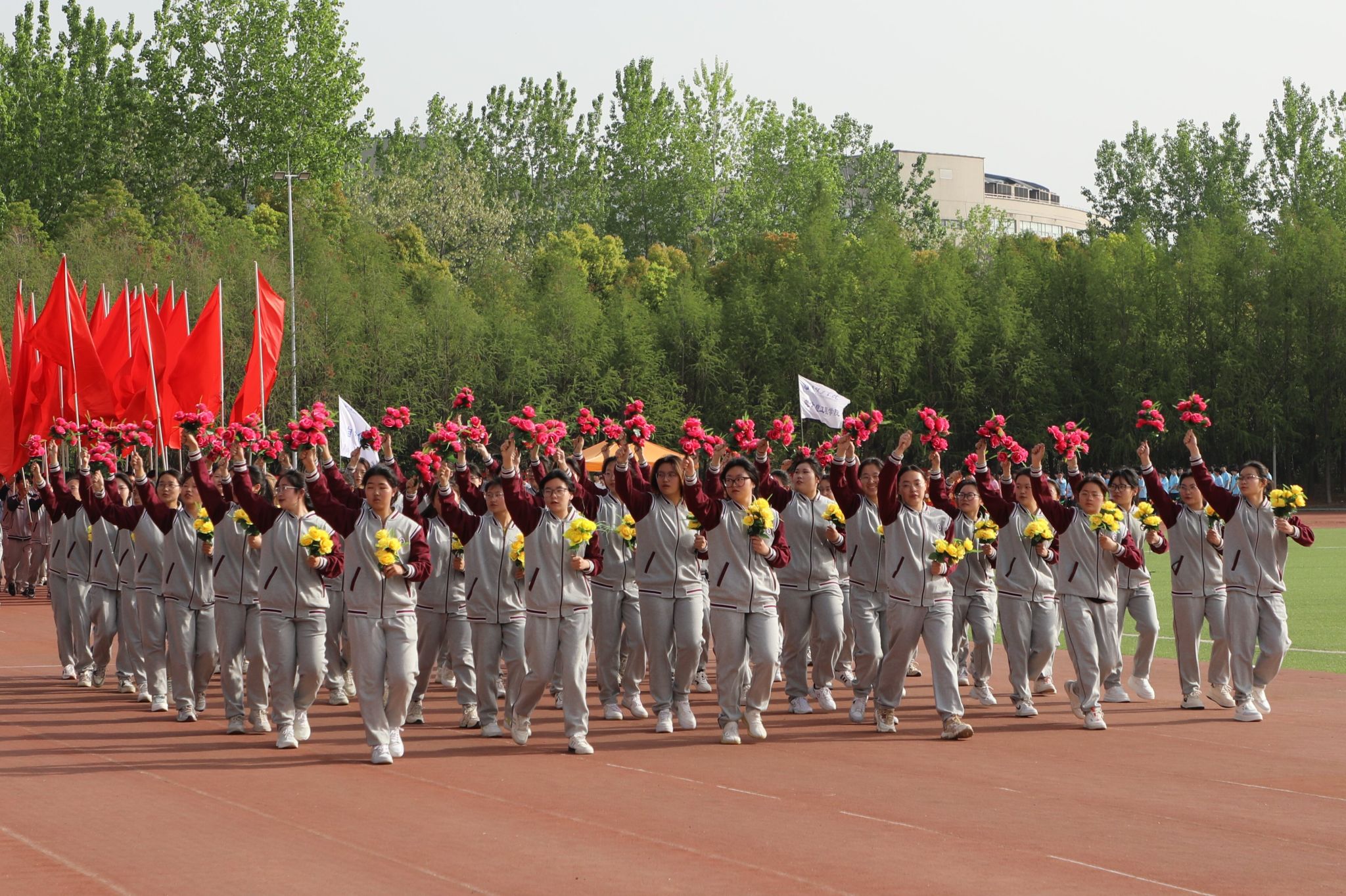 伴随着《运动员进行曲》的激昂旋律,在国旗方队的引领下,各二级学院学生方队和教职工方队迈着坚定有力的步伐,精神饱满、意气风发地依次入场。各二级学院将专业特色与时代精神融入入场式,方阵亮相富有创意、精彩纷呈,充分展现了我校师生的精神风貌和青春活力。