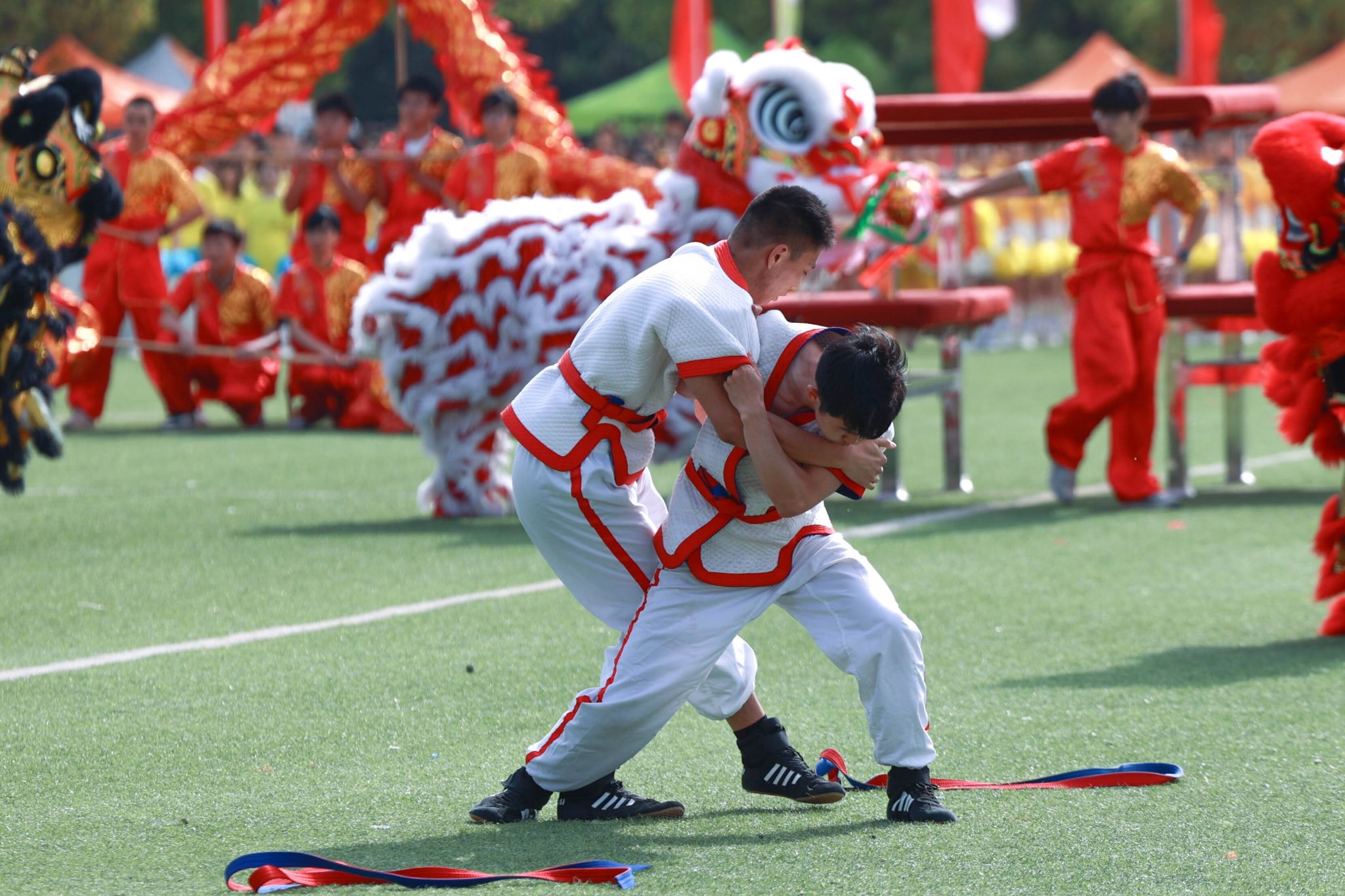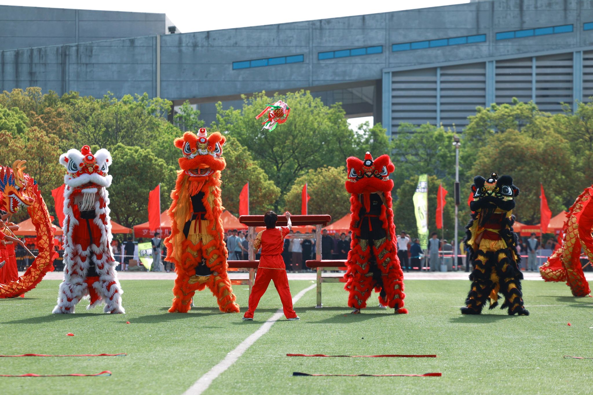 入场式后,“龙狮鼓韵”舞龙狮、“跤锋飞扬”摔跤、“奔跑的青春”团体舞、千人团体操等节目依次上场表演,现场表演灵动活泼、朝气蓬勃,将体育精神与艺术魅力有机融合,引来观众阵阵掌声,将现场氛围推向高潮。