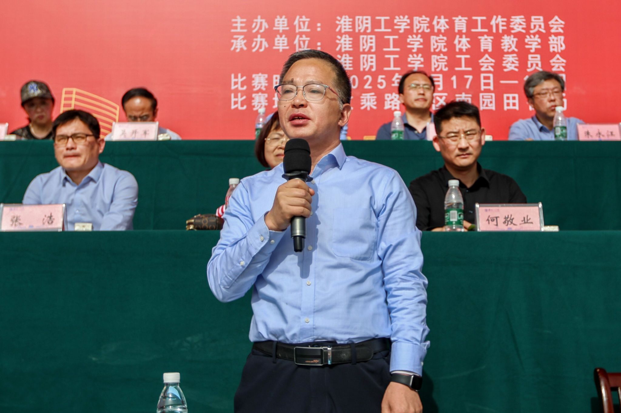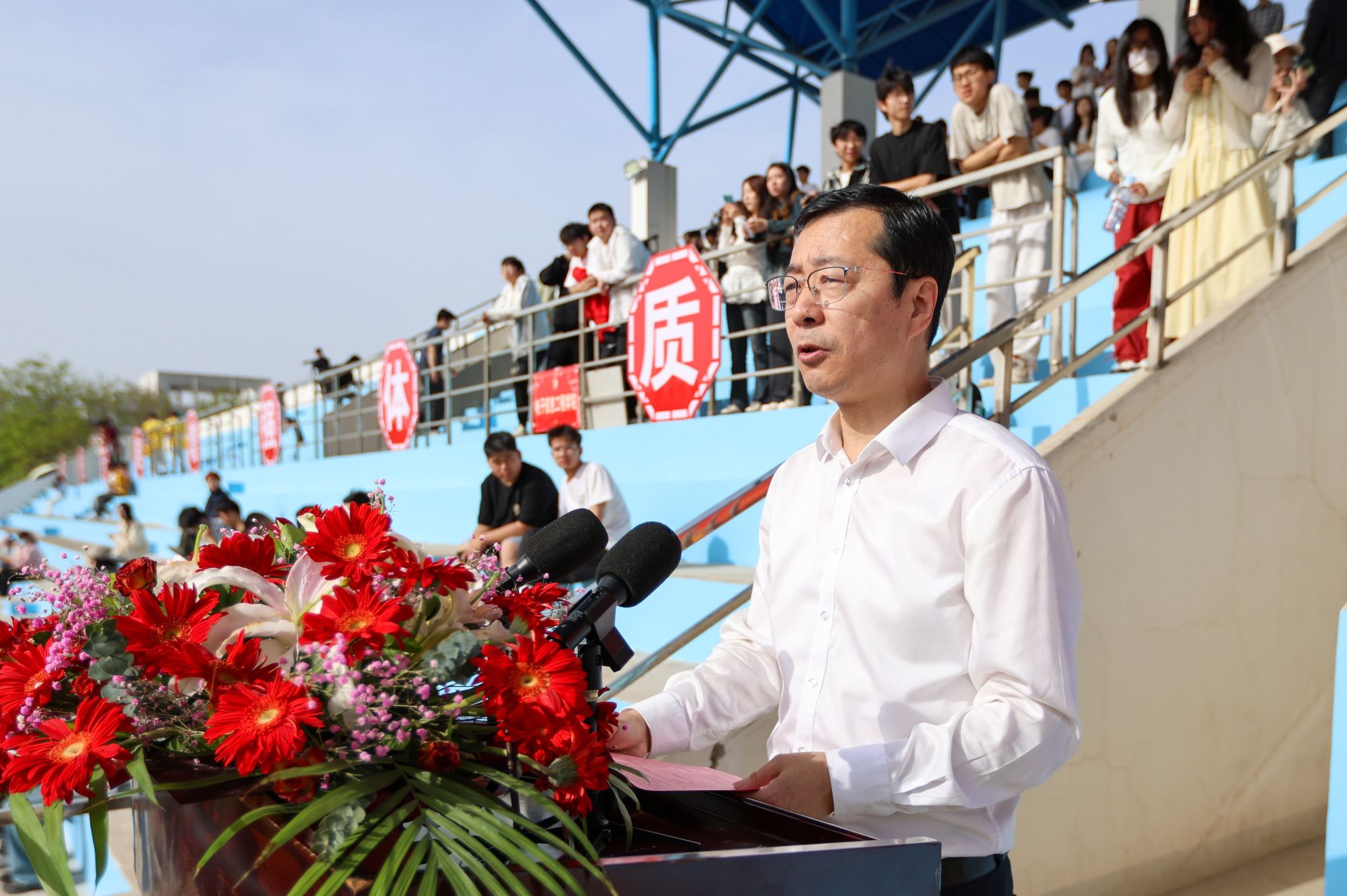 4月17日,我校第二十五届学生运动会暨第十一届教职工运动会在枚乘路校区南园田径场开幕。全体在淮校领导出席开幕式。校党委书记常绿宣布运动会开幕,校长郑锋致开幕词,副校长王立彬主持开幕式。