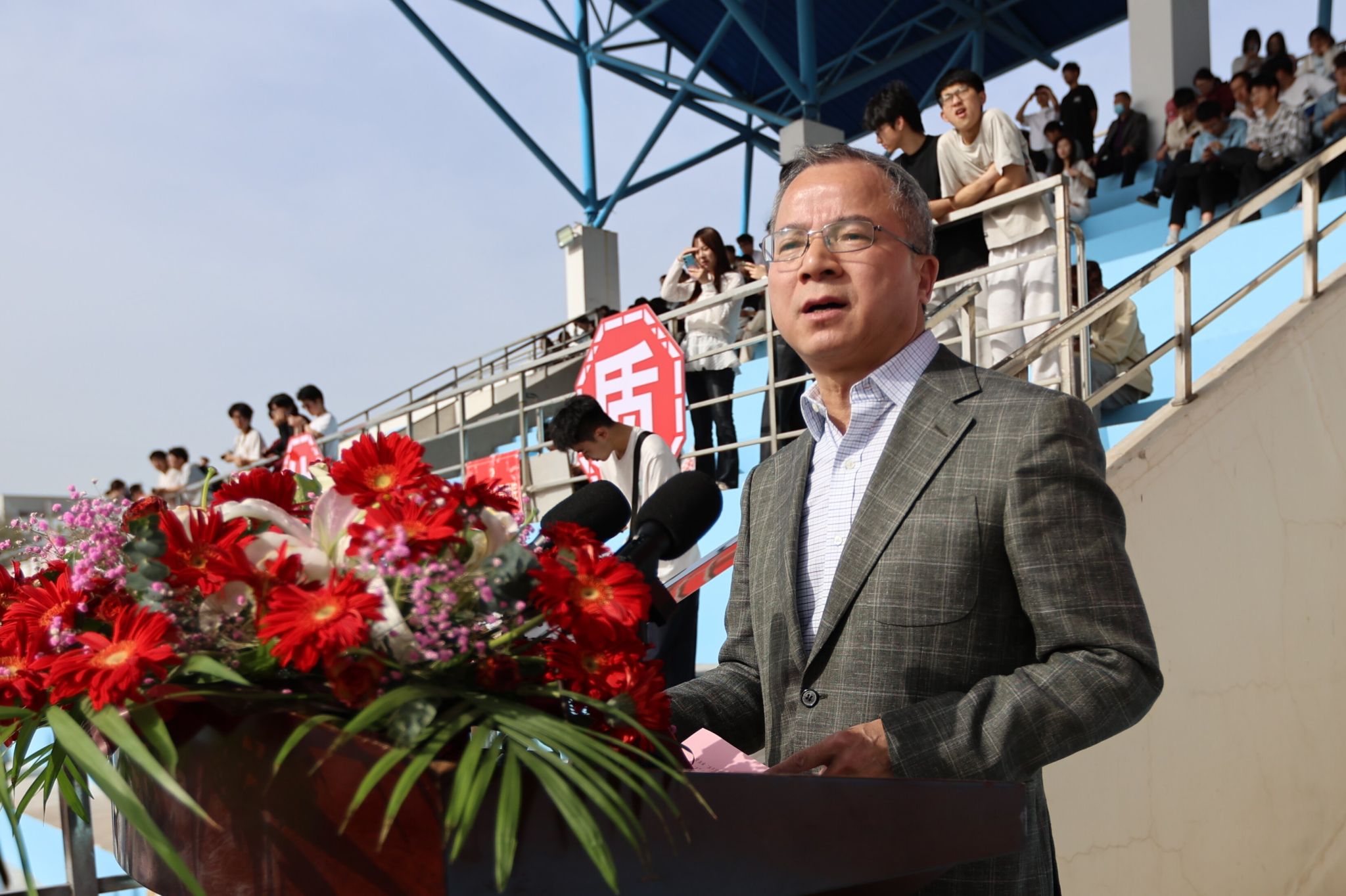 郑锋代表学校对本届运动会的召开表示热烈祝贺,向为运动会举办而辛勤工作的各位老师和同学表示感谢。他指出,学校坚持把“无体育,不大学;无运动,不青春”和“健康第一”作为体育工作的指导思想,把培养终身崇尚和参加体育运动习惯作为体育工作的理念和责任,不断加大体育投入,改进体育运动设施,拓展体育运动空间,着力构建高水平的体育育人体系,有力地推动了体育工作与学校事业发展同频共振,形成了珍视健康、热爱运动、积极向上的良好氛围,体育工作成效明显,大学生体质健康明显提升,竞技体育多项赛事取得优异成绩。运动会既是对学校体育工作的集中检阅,也是师生精神风貌、集体意识、拼搏精神的综合展示。希望以此次运动会为契机,使“我运动,我健康,我快乐”的理念深入心中,使运动成为习惯,强健体魄,砥砺意志,在运动和汗水中领略体育运动的魅力和快乐,在竞争和拼搏中激扬年华、焕发活力!